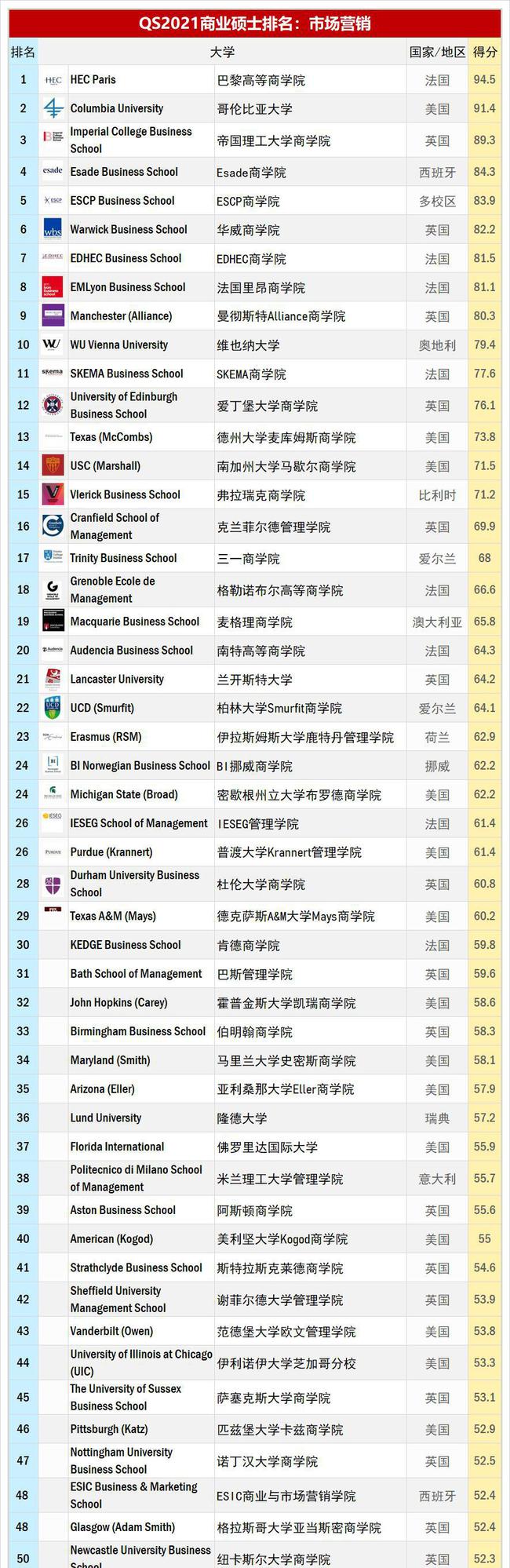 2020年9月23日,全球高等教育和商科教育研究机构QS Quacquarelli Symonds发布了2021QS商科硕士排名,该排名总共包括了商业分析硕士、金融硕士、管理硕士、市场营销硕士,和供应链管理硕士这五大商科专业。以下是2021QS商科硕士排名TOP100:市场营销硕士。