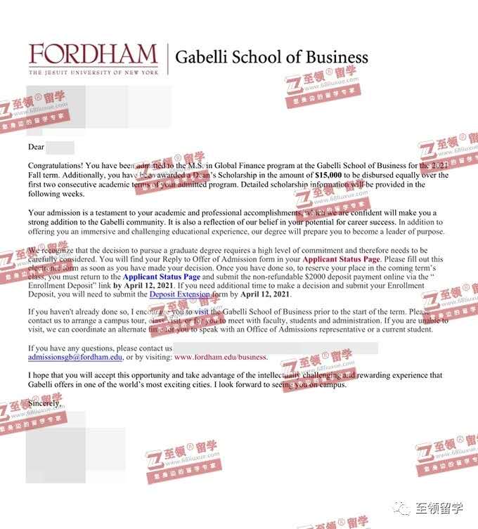 录取结果:Fordham,MS in Global Finance福特汉姆大学全球金融硕士录取+奖学金$15000