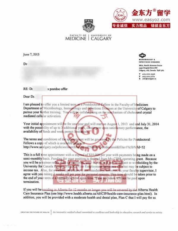 录取结果:Faculty of Medicine, University of Calgary Postdoctoral Fellow with a stipend payment $35,000 per year