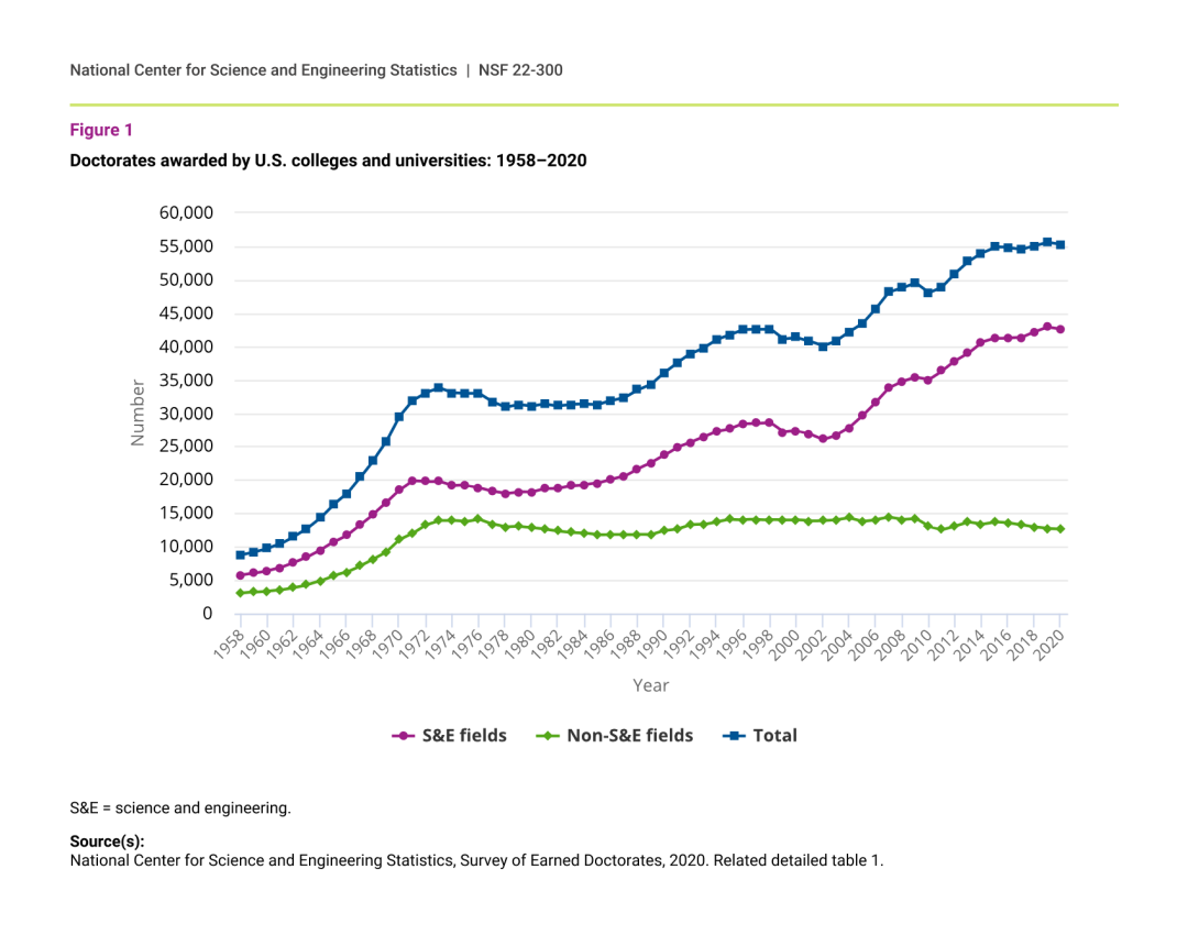 从1980年到2020年,获得S&E博士学位的人数增加了一倍多,而2020年获得非S&E博士学位的人数下降到略低于1980年的数量。