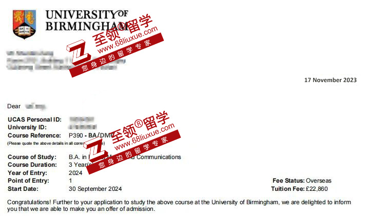 M同学对传媒类专业感兴趣,根据学生意向,文书老师为其量身定制了英国TOP20+其他院校保底的申请方案。M同学的申请在十月初递交,两周后获得伯明翰大学OFFER。