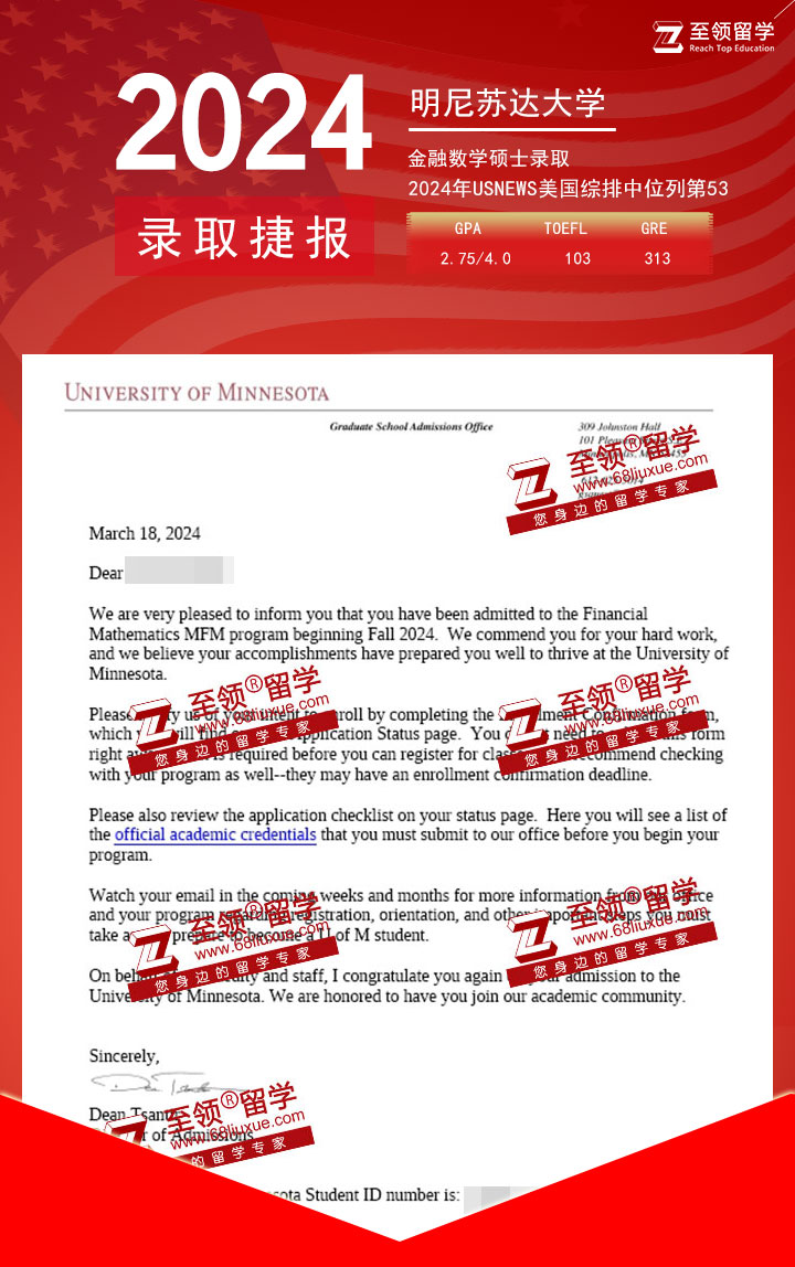 录取结果:University of Minnesota,Master of Financial Mathematics 明尼苏达大学金融数学硕士录取