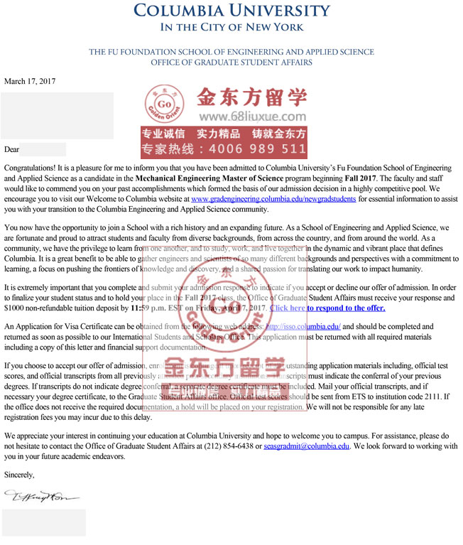录取结果:Columbia University哥伦比亚大学, Master of Science in Mechanical Engineering机械工程硕士