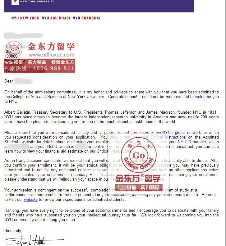 文书的写作过程非常的顺畅,D同学已经有了丰富的经历,再将个人学习目标和理想包装一番,就是一套好的文书材料。后续的提交网申、送分、邮寄材料都是由我们的老师完成,D同学及时提供材料保证了申请的顺利完成。在得知D同学被纽约大学预先录取了,我们真的是深感欣慰。