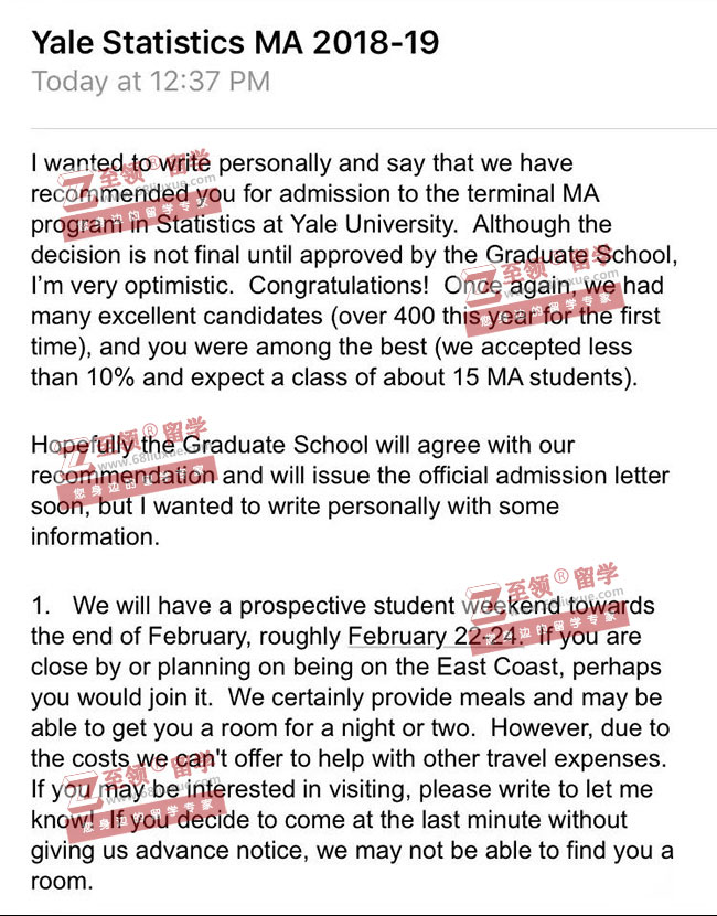 当得到消息的时候,X同学简直不能相信这是真的,连我们团队的老师都感到意外,因为耶鲁大学统计专业的录取难度实在太大啦,据说今年的申请人数达到400多,而学校只发15份OFFER,录取率只有不到4%啊!