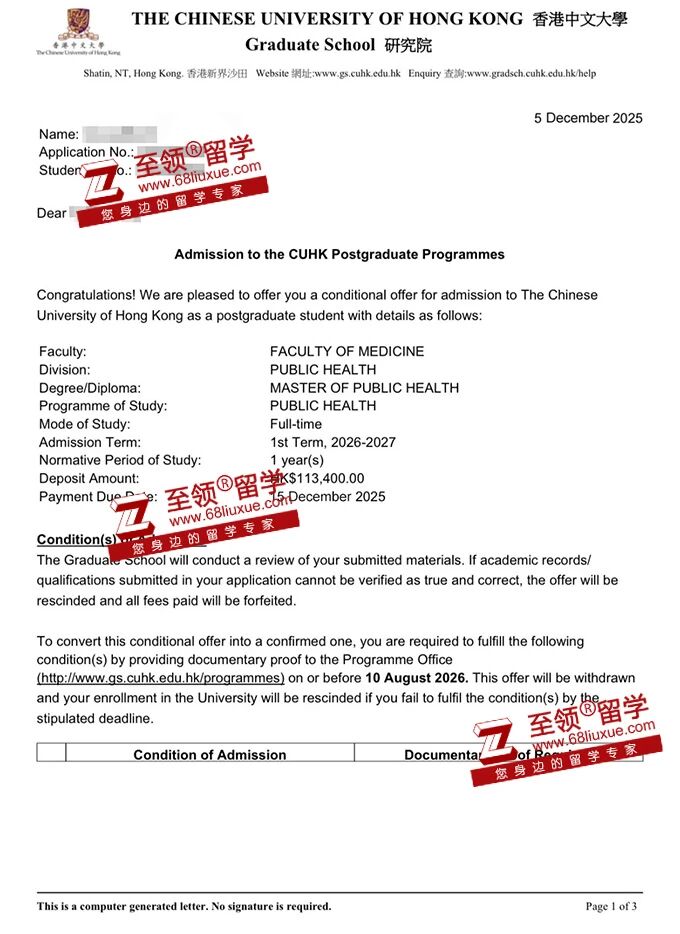 香港中文大学,MPH录取