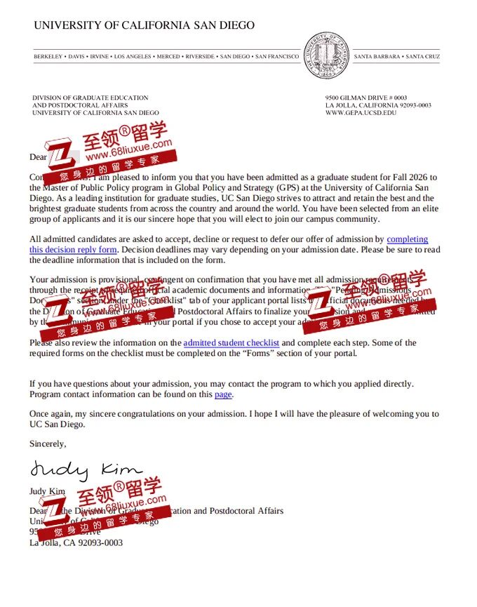 录取结果:加州大学圣地亚哥分校MPP录取
